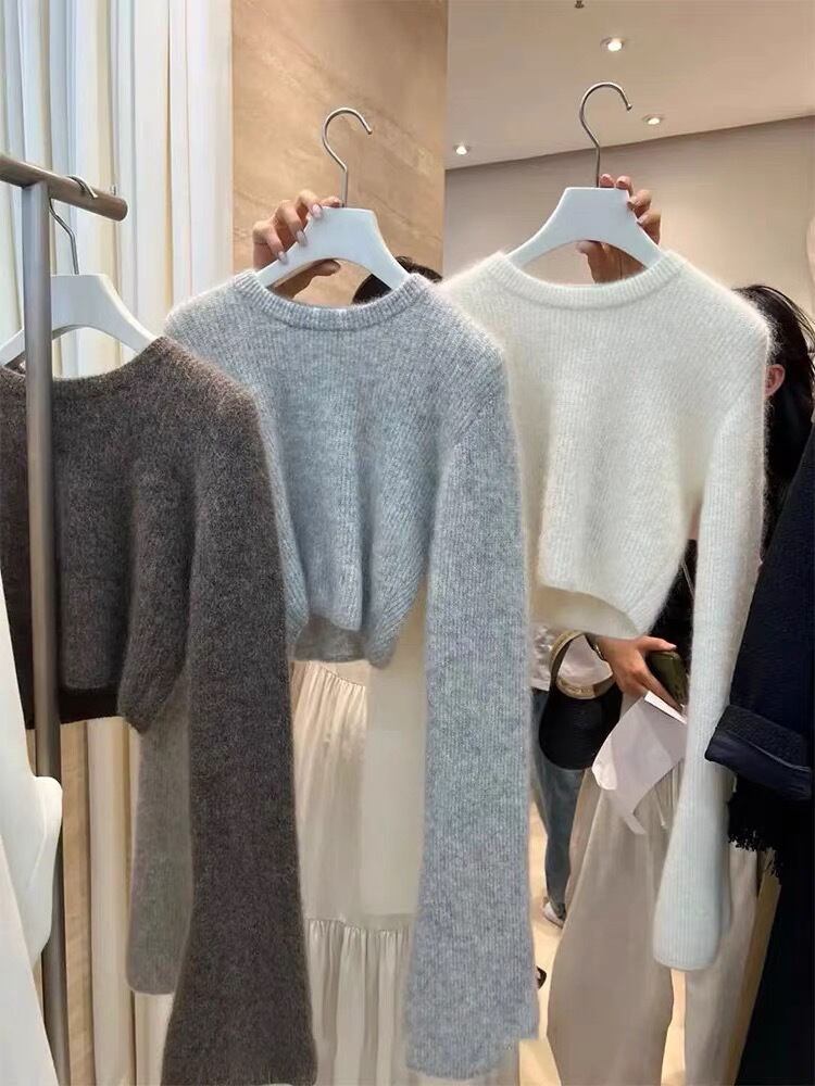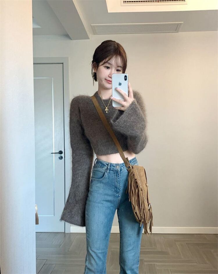 △ もこもこニットクロップドトップスは、あたたかくてふんわりした素材感が特徴です。 このトップスは、今季のトレンドであるクロップド丈で、袖口がフレアになっていてカジュアルなスタイリングにぴったりの女性らしさを引き立てくれるアイテムです。