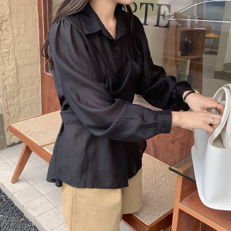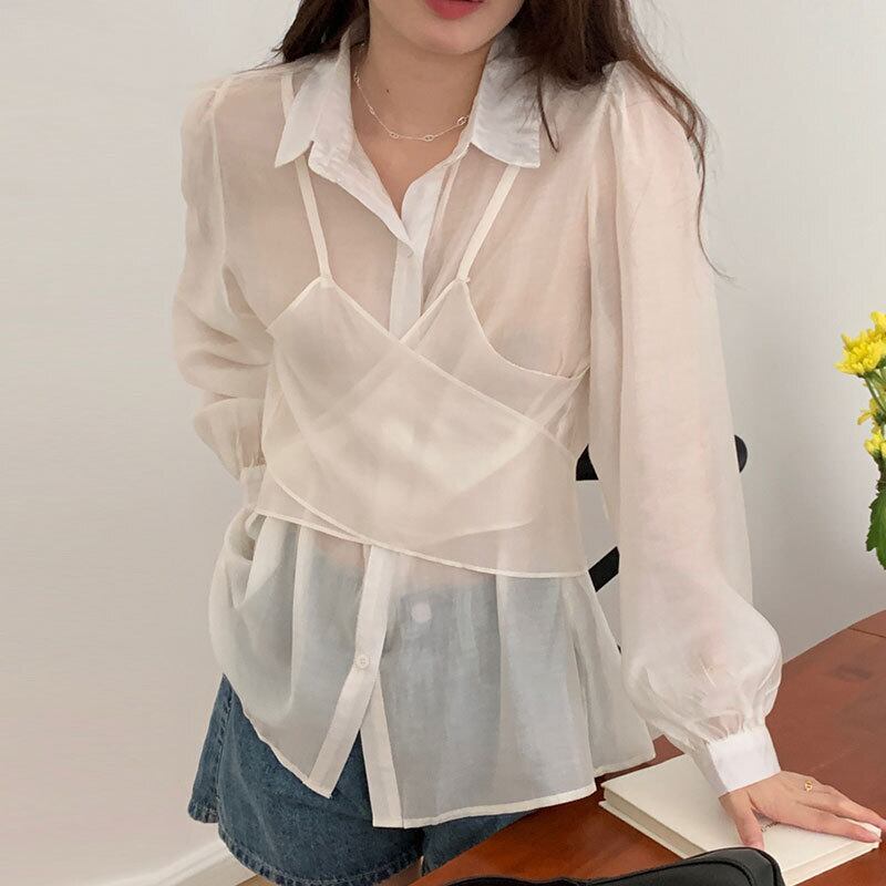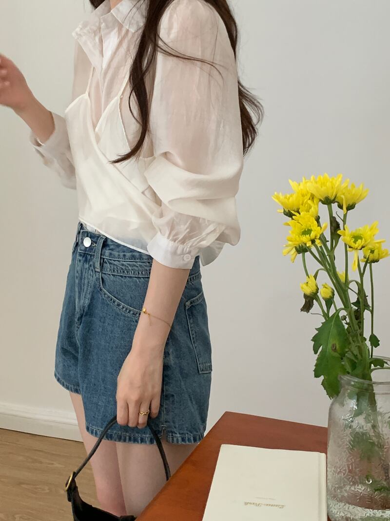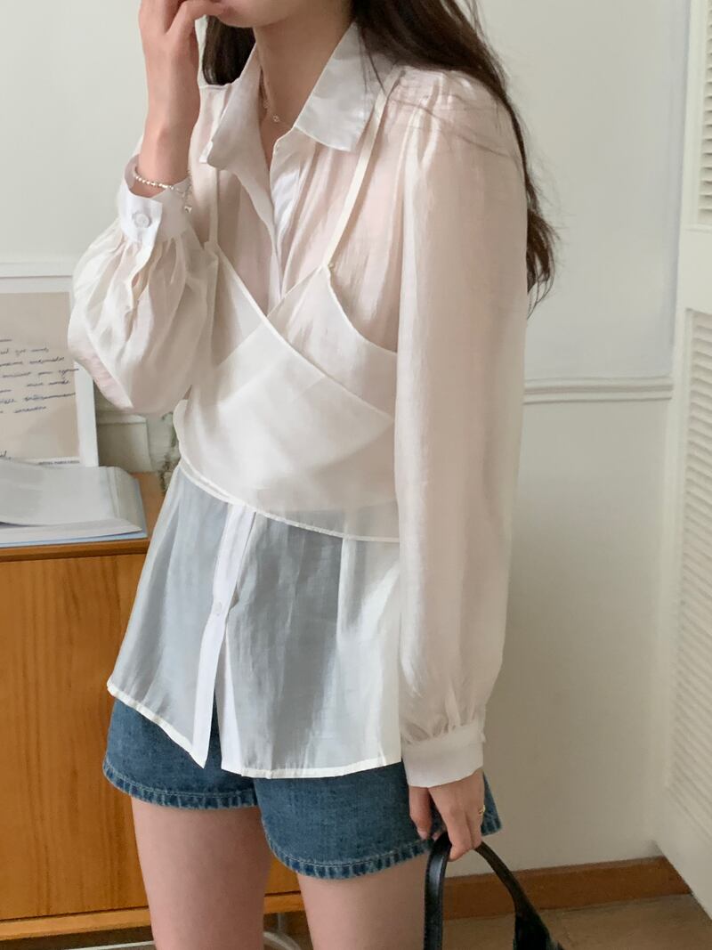 △ シースルークロスシャツは、透け感のある素材とクロスデザインが特徴的な一枚です。女性らしい色合いとおしゃれなデザインが相まって、存在感のあるコーディネートが楽しめます。シンプルながらも上品さを演出するアイテムでほどよい抜け感を与えてくれます。透け感がありながらも、程よい露出度なので大人の女性にぴったりです。